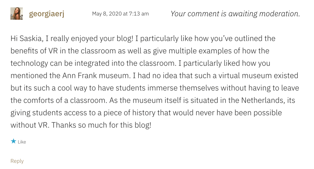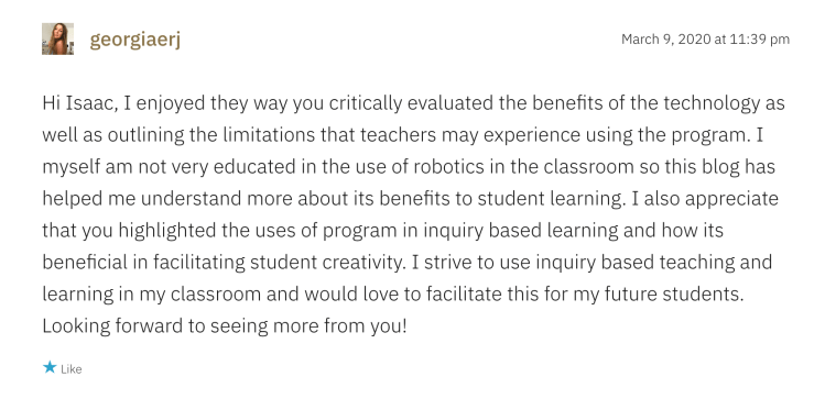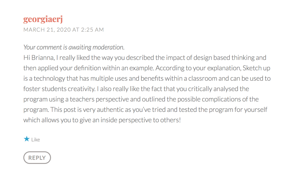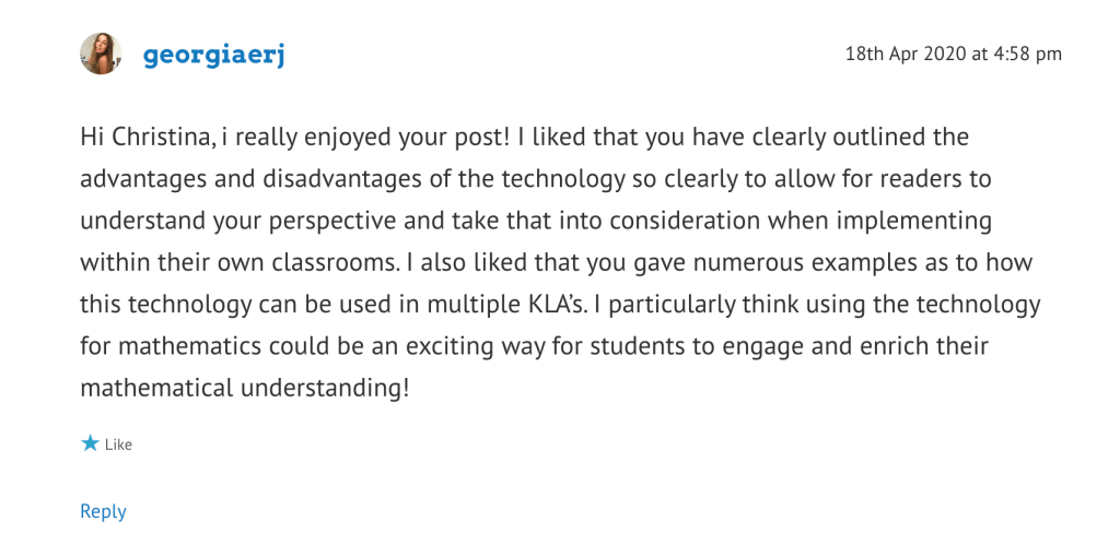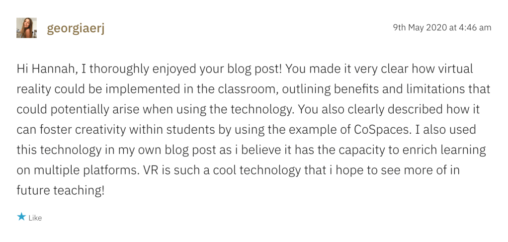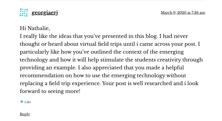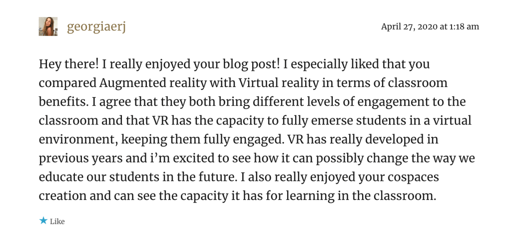 Community Engagement https://educ3620nathalie.wordpress.com/2020/03/08/virtual-field-trips/https://isaacsmith.school.blog/2020/03/09/task-1-learning-technology-critique/\ https://techmeetscreativity.wordpress.com/2020/03/11/week-2-enhancing-literacy-using-adobe-spark/https://briannaglavinovic.wordpress.com/2020/03/16/design-based-thinking-using-sketchup/ https://austyn.school.blog/2020/04/02/computational-thinking/https://chatchman.school.blog/2020/04/08/ar-technologies/comment-page-1/#comment-5 https://isaacsmith.school.blog/2020/04/25/week-7-virtual-reality/https://marksdigitalblog353.wordpress.com/video-conferencing-technologies-zoom/ https://smoffatt.school.blog/2020/05/01/can-vr-assist-learning/https://hannahs362.school.blog/2020/04/26/week-7-virtual-reality-cospaces/ Share this: Click to share on X (Opens in new window) X Click to share on Facebook (Opens in new window) Facebook Like Loading...